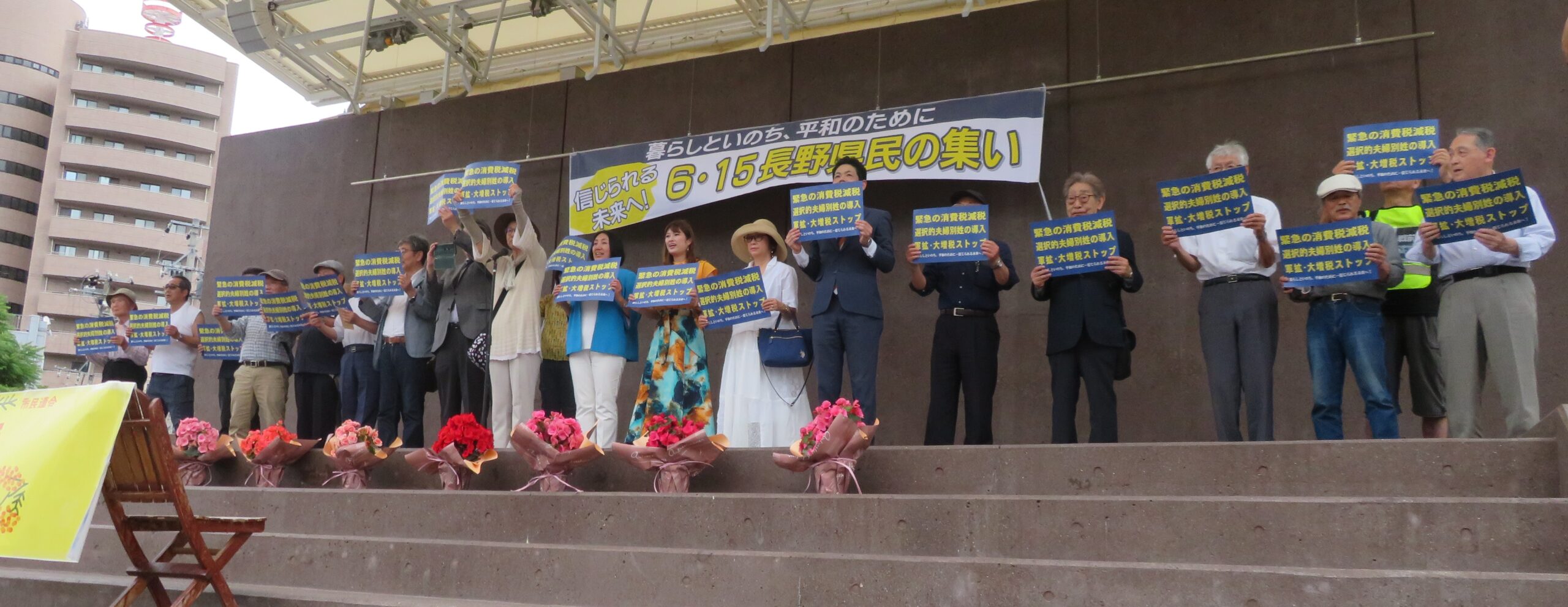 6月15日、長野市の表参道セントラルスクゥエアで「信じられる未来へ!6・15長野県民のつどい」が開催され、県内から参加した約500人の市民らが緊急の消費税減税やジェンダー平等社会の実現などを訴えた。県保険医協会からは宮沢裕夫会長が呼びかけ人として参加した。